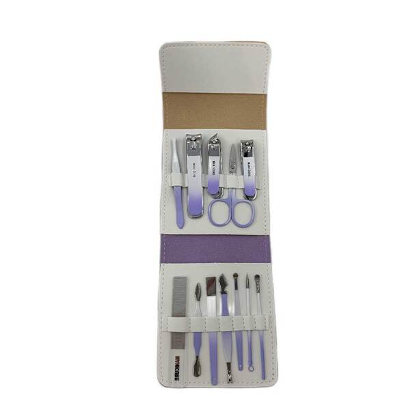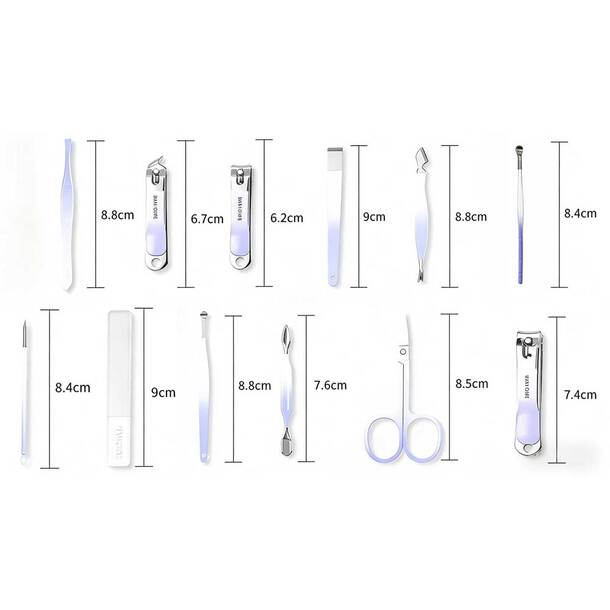 Each piece is crafted from highly polished stainless steel for durability and precision, including tweezers, curved-blade nail clippers, small clippers, a solid glass nail file for smooth edges, eyebrow scissors, a small diagonal cutter, pedicure knife, dead-skin remover, nail scraper, double pick, ear spoon and acne needle.